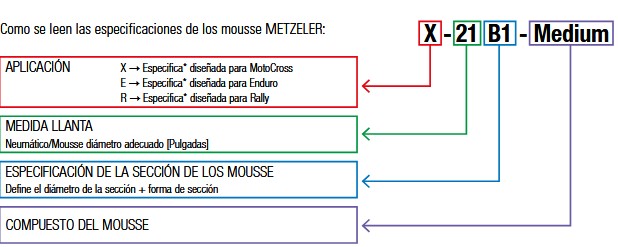 Los mousses son espumas de goma las cuales – además de evitar pinchazos en los neumáticos durante las secciones duras en el off-road – incorporan propiedades dinámicas capaces de rodar más rápido, con más eficiencia o simplemente con menor esfuerzo en las competiciones de off-road. Los mousses METZELER están diseñados para reemplazar las cámaras en los neumáticos de off-road, ya sea para competiciones de Enduro como Motocross; una vez montados, los mousses METZELER simulan una presión de inflado equivalente a 0.7bar +/-0.1, lejos de la presión recomendada para un uso en carretera.